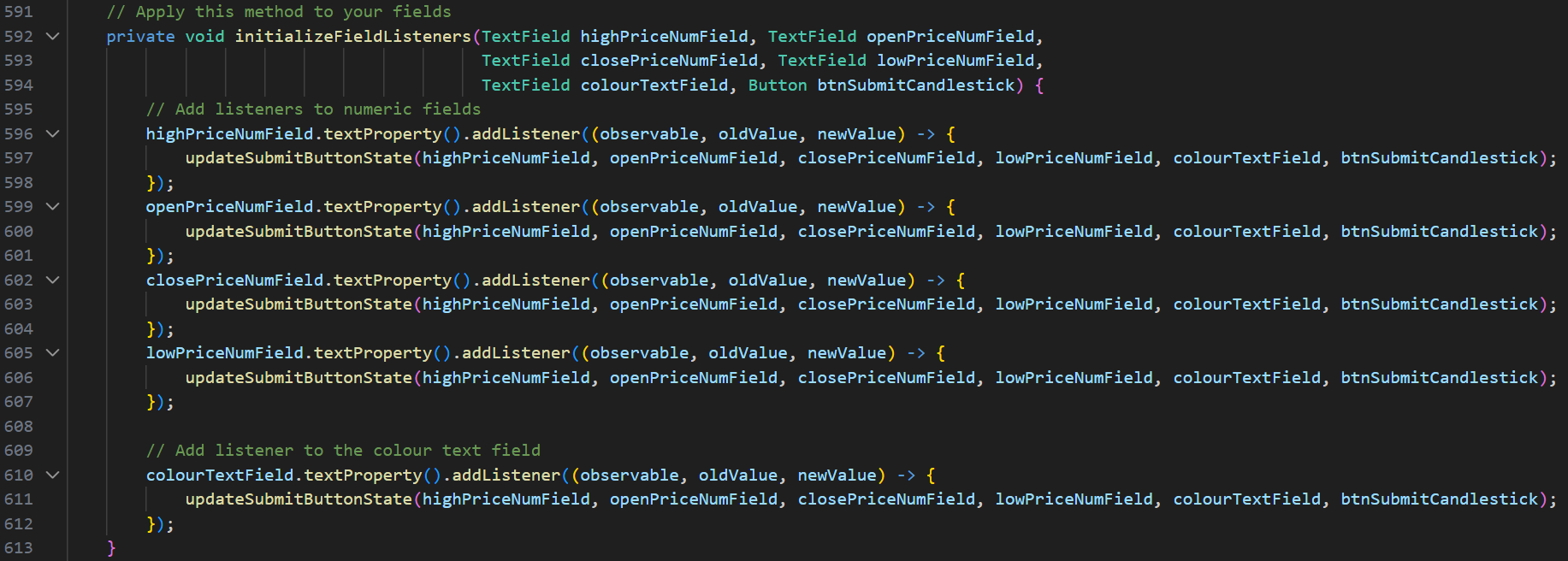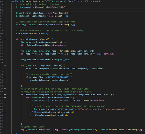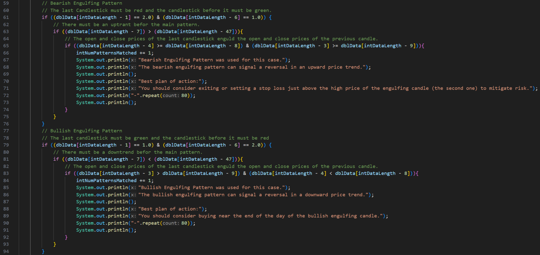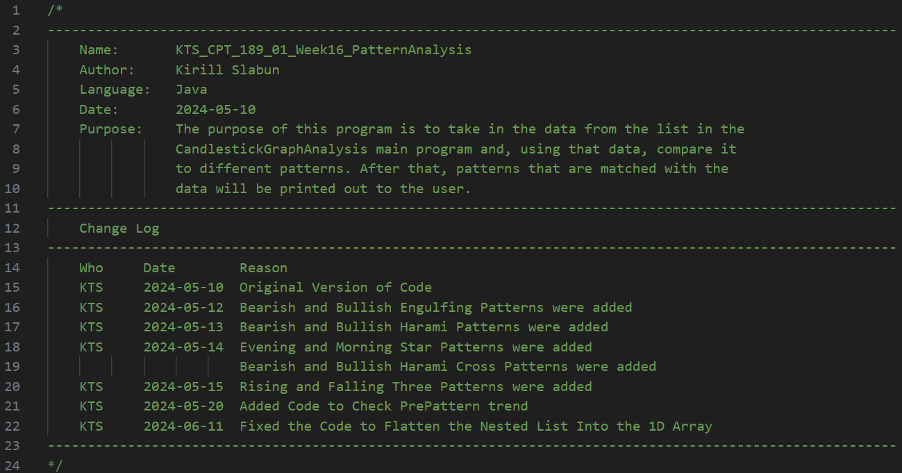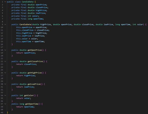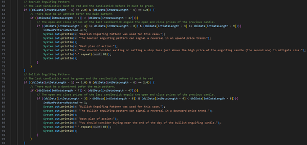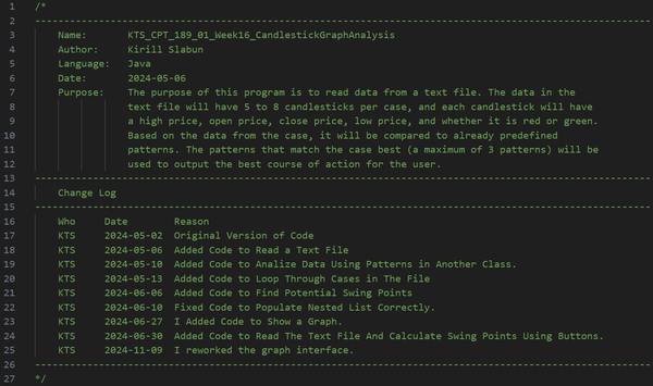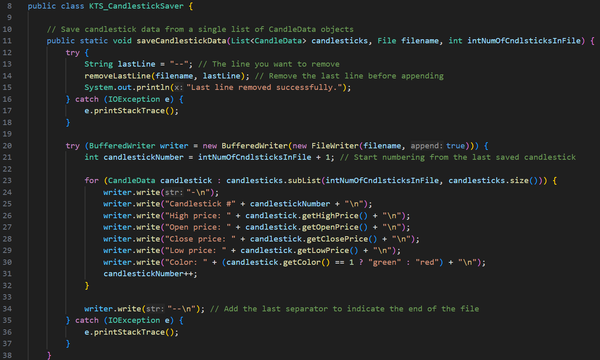 Initially, this project was part of my coursework, with my main objective being to extract candlestick data from a text file and identify trading patterns such as Engulfing, Harami, Evening Star, Morning Star, Harami Cross, Rising Three, and Falling Three. The project also required using the JavaFX library to create an interactive UI. I also had to follow strict coding naming conventions (camelCase), formatting, commenting, and best practices, which I follow to this day.