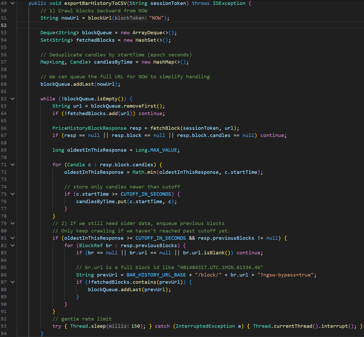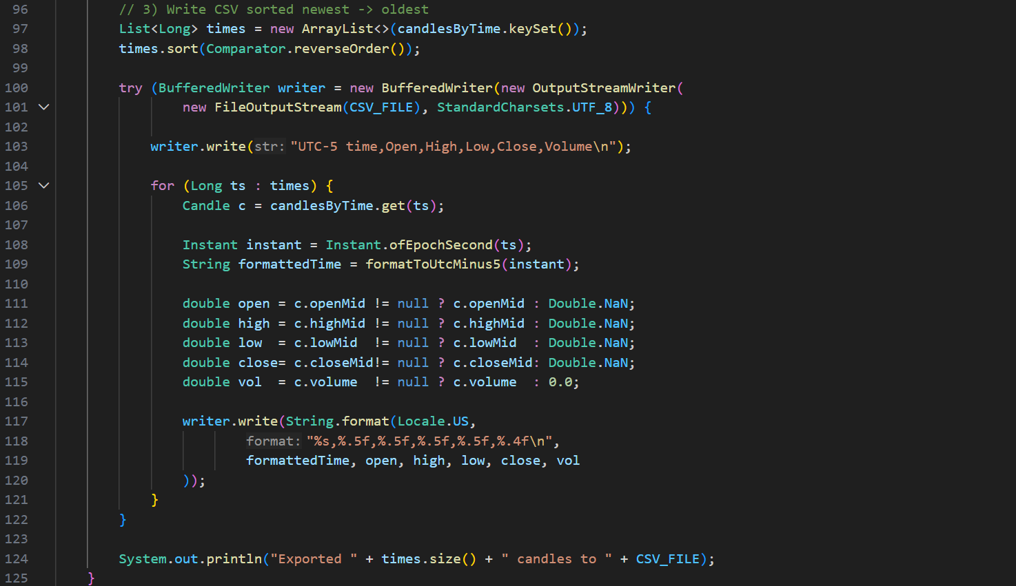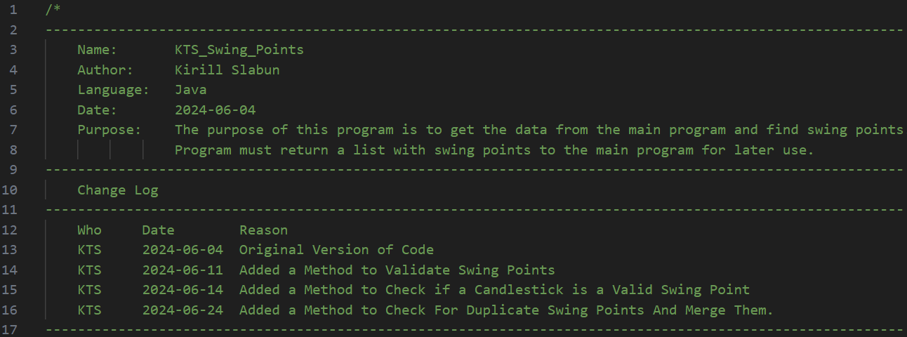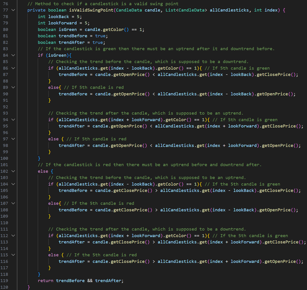 After I had finished the course, I didn’t stop developing my program. I later implemented my own swing-point detection algorithm that considers 5 candlesticks before and after the possible swing point. If there is an uptrend on 5 candlesticks before and a downtrend on 5 candlesticks after (high swing point), or a downtrend on 5 candlesticks before and an uptrend on 5 candlesticks after (low swing point), the candlestick would be marked as a swing point. Then the swing point had to go through another algorithm that slides a window over all the candlesticks, and if there were more than one same-type swing point within the window, only the highest or the lowest swing point would be left, depending on the type of swing points in the window.