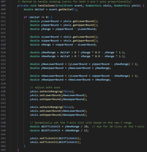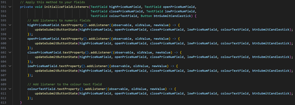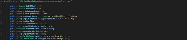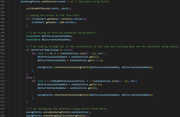 I have also significantly improved the User Interface using JavaFX, implementing a graph that users can interact with, as well as various fields and buttons for calculating swing points, reading and saving data to the file, and adding new candlesticks to the file.