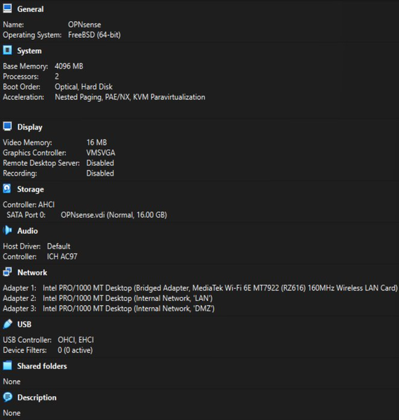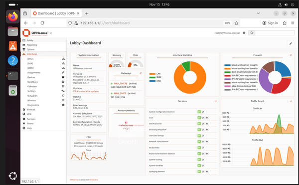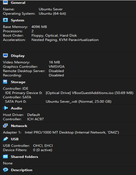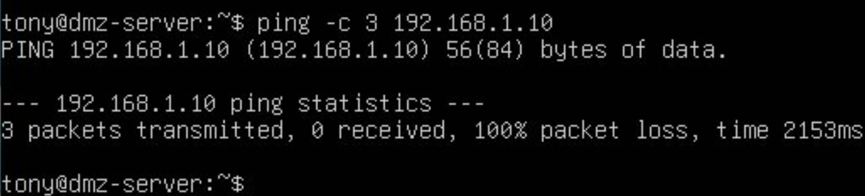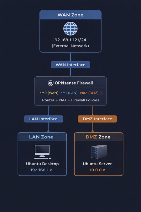 OPNsense Firewall acted as the central router and security gateway. Firewall handled NAT, firewall rules, DHCP, and inter-zone routing. The purpose of Ubuntu Server was to host services in an isolated zone. Ubuntu Desktop was used to monitor, administer, and test connectivity. Tools such as the browser, ping, traceroute, and Wireshark were run on Ubuntu Desktop. Ubuntu Desktop was used on an internal employee workstation.