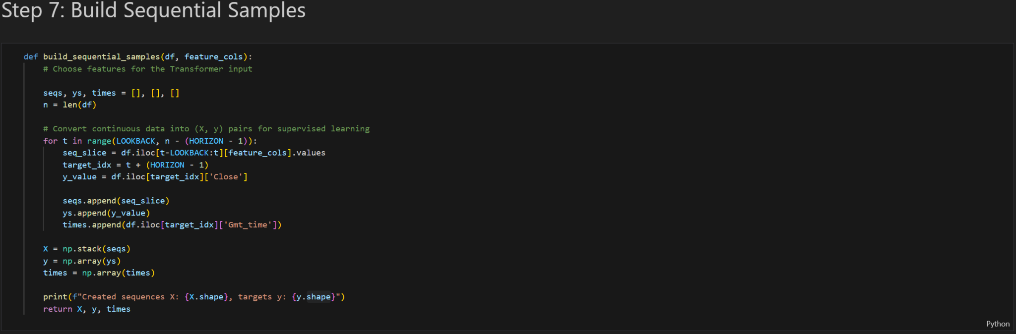 The main objective of the Transformer model is to predict the closing price of the following hourly candlestick using a 48-hour lookback window. My project consisted of four parts: