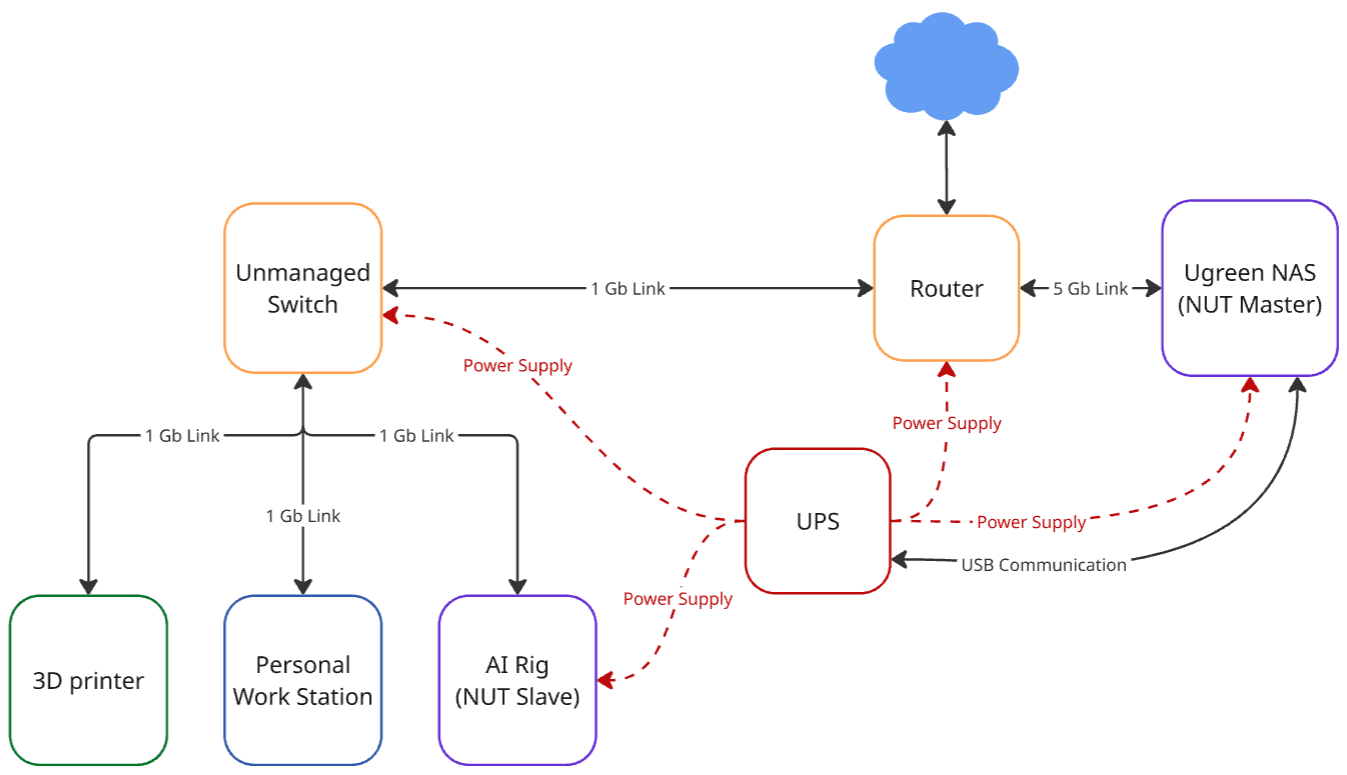 My home lab consists of a router, a 6-port 1 GB unmanaged switch, CyberPower CP1500PFCLCD UPS, UGREEN DXP4800 Plus with two 30TB disks, a custom AI rig, a 3D printer, and my personal workstation. The lab was designed around two high-priority machines, AI Rig and NAS. The resources were strategically used to provide those two machines with everything they needed for continuous operation, resilience to unexpected power events, and hardware/data safety.